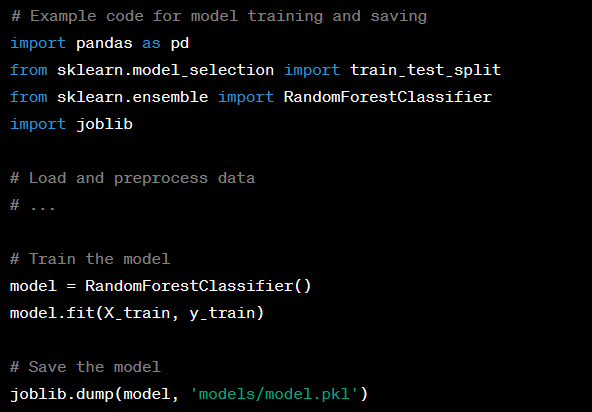Use the “joblib.dump” to save the trained model to a designated folder (models) within your project directory. Now, your Phyton-based ML model is ready for use!