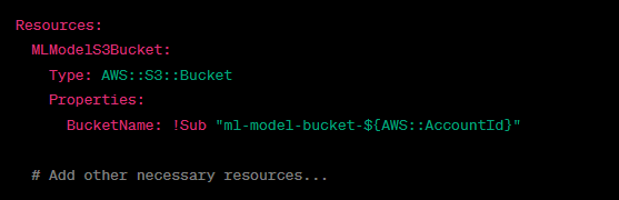 You can use a pre-build CloudFormation Template like the one below to create the S3 bucket, IAM roles, and other resources required to support your ML model functionalities.
