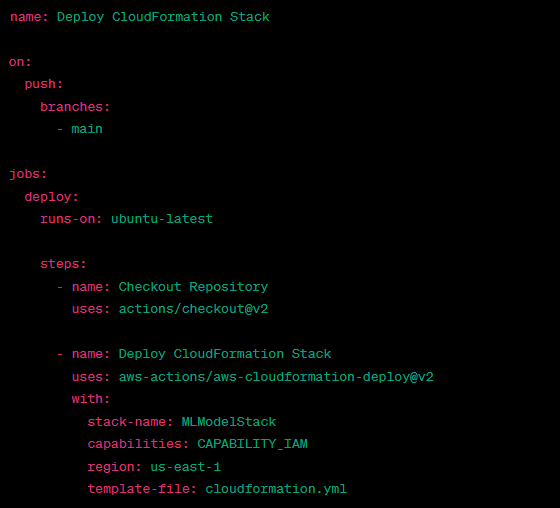 Likewise, you can define other AWS resources you want to deploy using this template. Next, you can use GitHub Actions to automate the deployment of your CloudFormation stack.